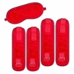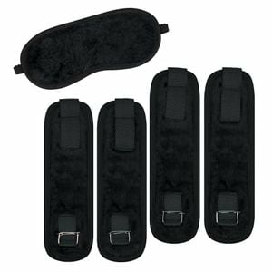 Ajustáveis e reguláveis de acordo com suas medidas de pulso e tornozelos para garantir conforto. Suas tiras são em poliéster com argola em metal. Detalhes de fivelas, fecho e travas em metal niquelado. Venda confeccionada artesanalmente em sintético semelhante à couro na cor preta, com revestimento aveludado.