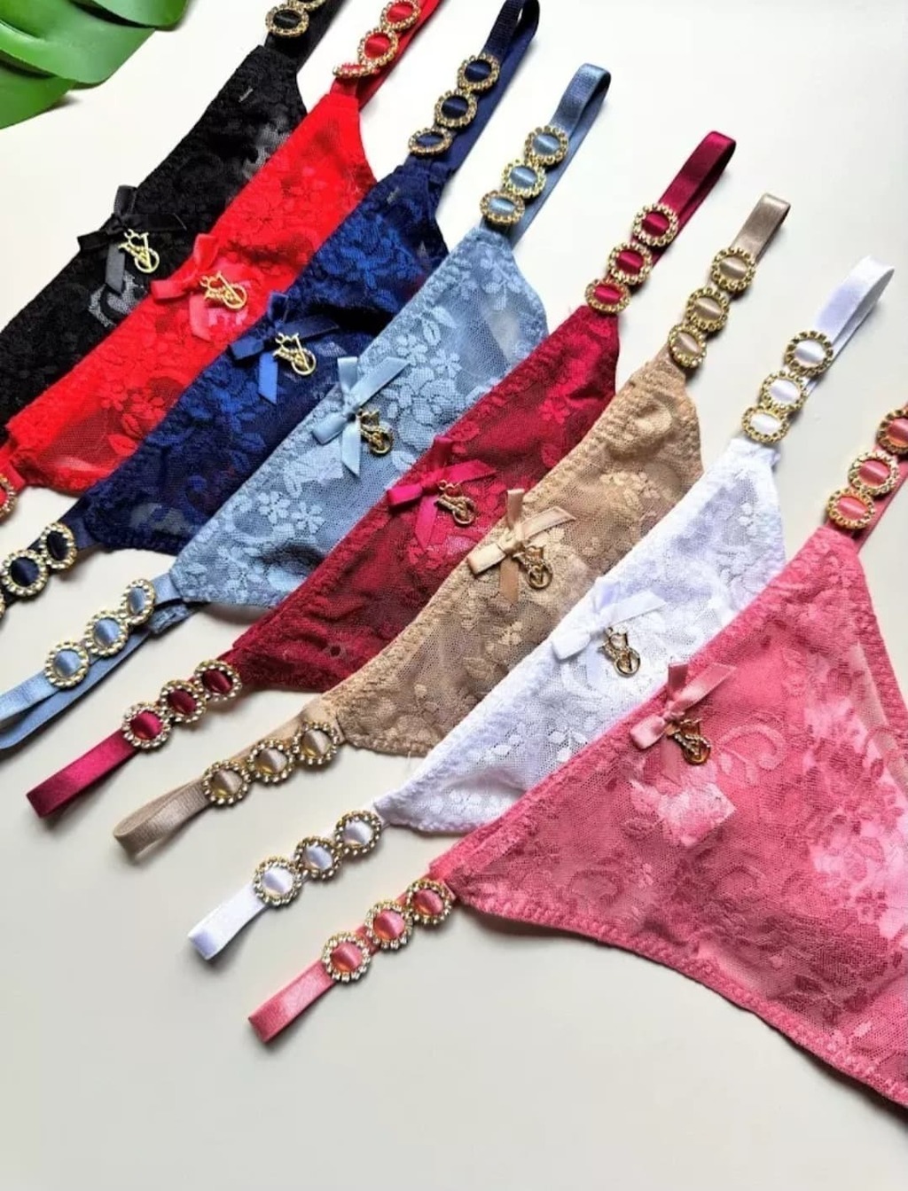 Tanga fio confeccionada em renda, detalhe lateral com argolas cravejadas móveis, com pingente em metal dourado, e fundinho forrado em algodão.